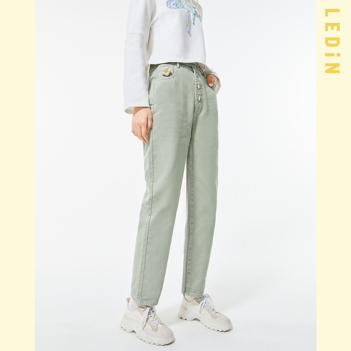 直筒牛仔褲女2021年春季新款褲子女裝童趣花花牛仔褲寬鬆